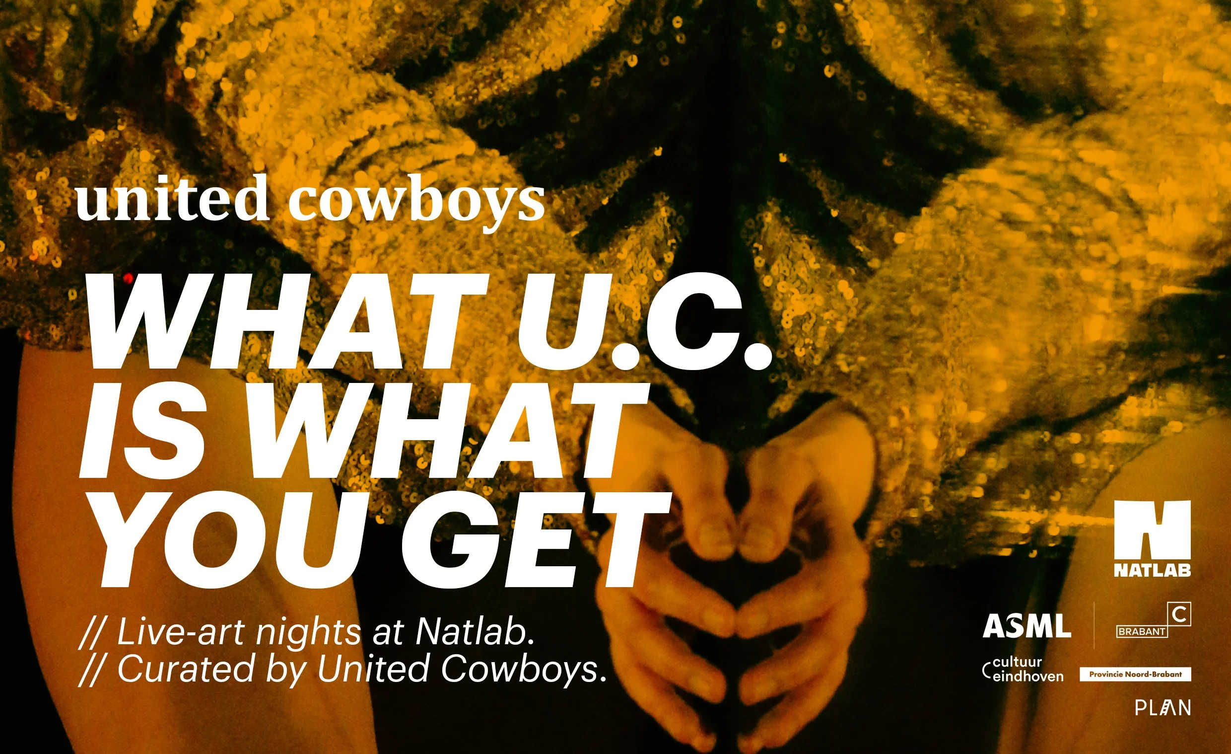Under the title WHAT U.C. IS WHAT YOU GET, United Cowboys will ‘invade’ the iconic Natlab Eindhoven during two editions per season, with three evening-filling programs per edition, in which new regional work will be presented to an audience, along with international work. The project focuses on offering a sensory art experience. The audience is invited to experience different works from different backgrounds, consisting of dance, music, performance, video and plastic arts, in one ongoing flow. The space of Natlab will be peeled off, more and more we will conquer the Podiumzaal and - altogether - become part of a unique world of imagination and wonder. The program focuses on new developments; because of the personal and intimate approach United Cowboys implements, the presented work becomes more accessible, able to reach a larger audience, and has a connecting effect.